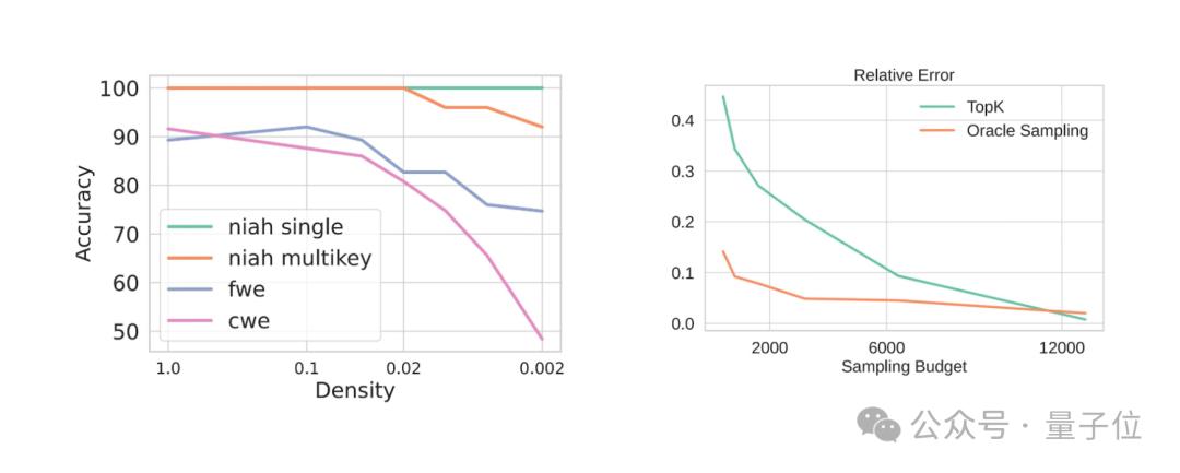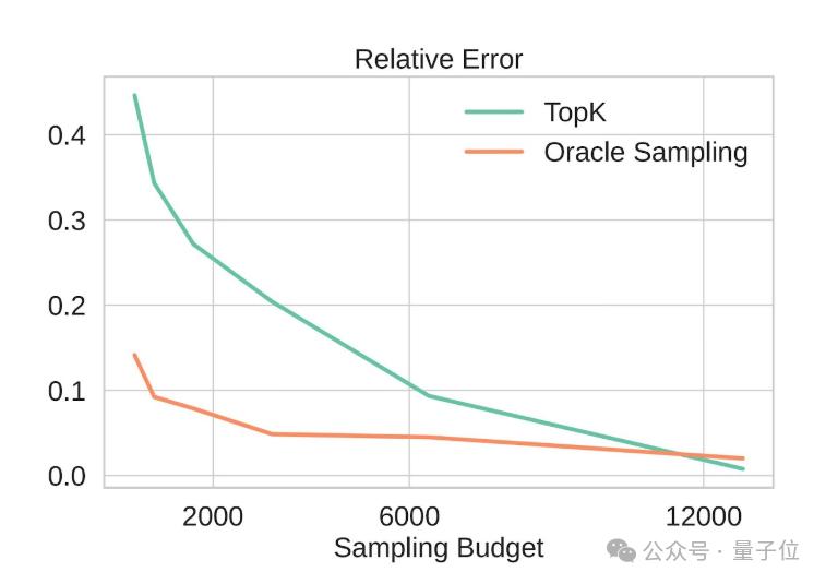 如图所示,基于注意力分数按比例进行采样(即所谓的Oracle Sampling,研究把注意力模块的输出看成value向量的期望值,对应的分布是注意力得分)相比于传统的TopK选择方法,其估计误差要小得多,最多可降低4倍。