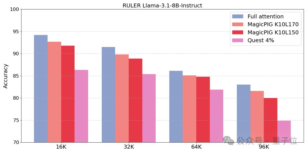 以Llama-3.1-8B-Instruct为例,MagicPIG在检索和推理任务中比Quest(稀疏注意力的SOTA基线)实现了更高的下游准确率。