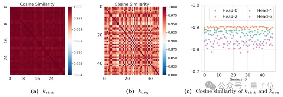 3、键状态的中心与汇聚点token的键状态几乎相反。(见右图, -0.9至-0.8之间)