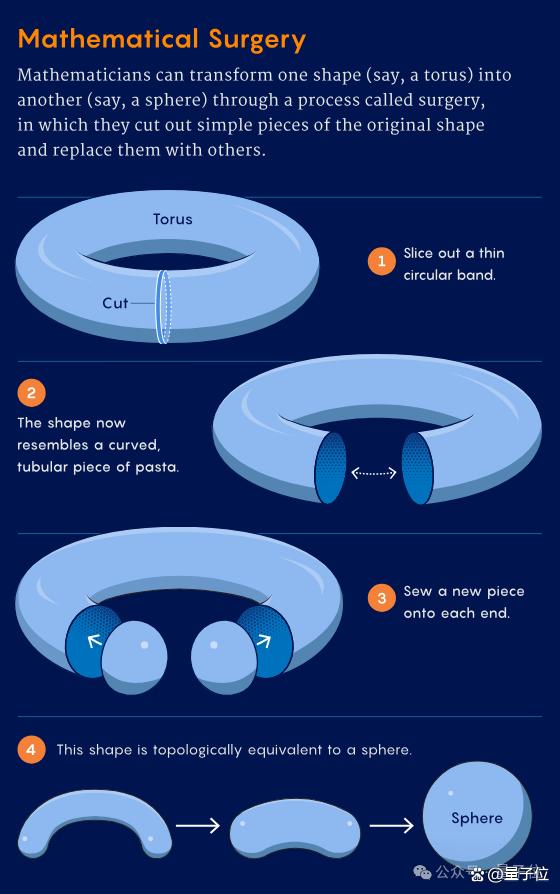 而surgery就像是对这个形状进行“整形”。需要先切掉一部分,然后沿着切口的边缘把新的部分缝上去。这个过程必须非常小心,不能留下任何尖锐的角或边缘,因为数学家希望新的形状是平滑的,就像一个完美的球面一样。