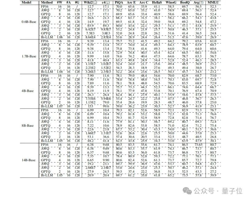 团队测试了5种经典PTQ方法,包括Round-To-Nearest (RTN)、GPTQ、AWQ、SmoothQuant和BiLLM,覆盖从1比特到8比特的位宽。