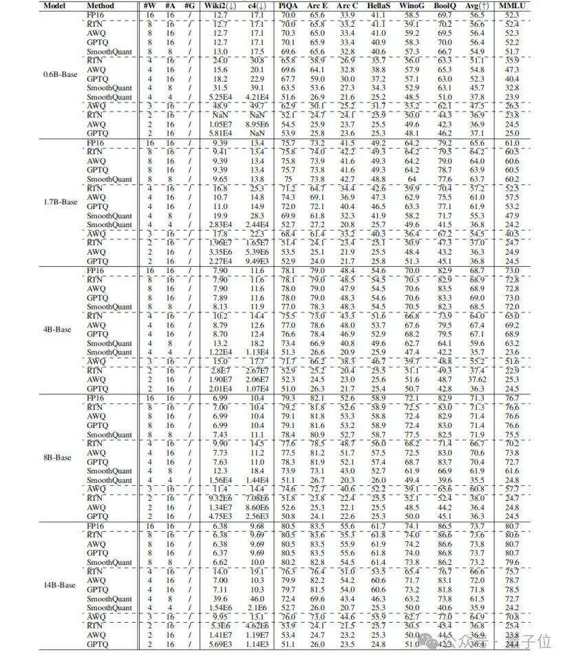 表3是Qwen3-Base模型每组1到8位的PTQ结果,验证了在Wikitext2和c4上的困惑度、零样本推理任务以及5样本的MMLU性能。其中G表示组大小。