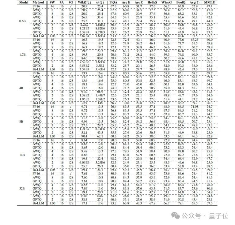 同时,团队观察到二值化方法Bi-LLM表现出相对有前景的结果,在32B模型中甚至超越了3比特的AWQ,凸显了二值化的潜力。