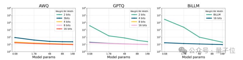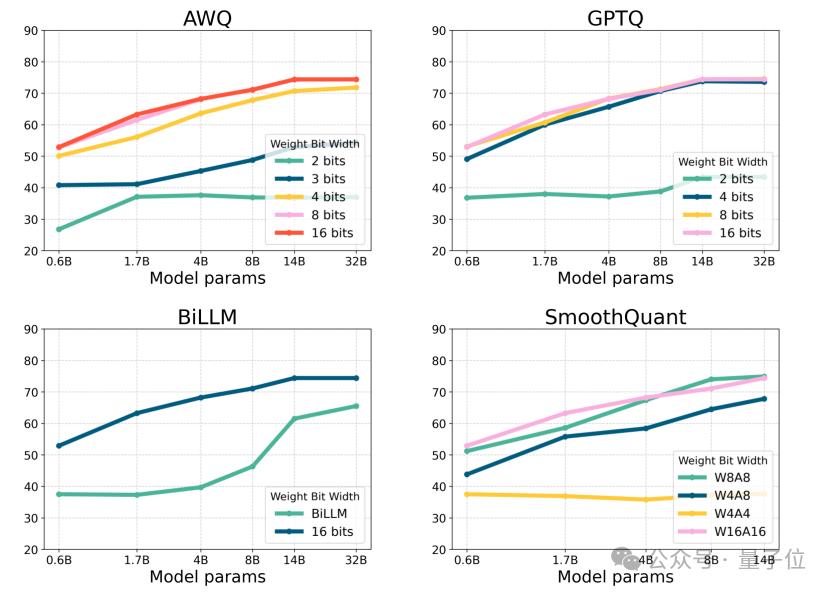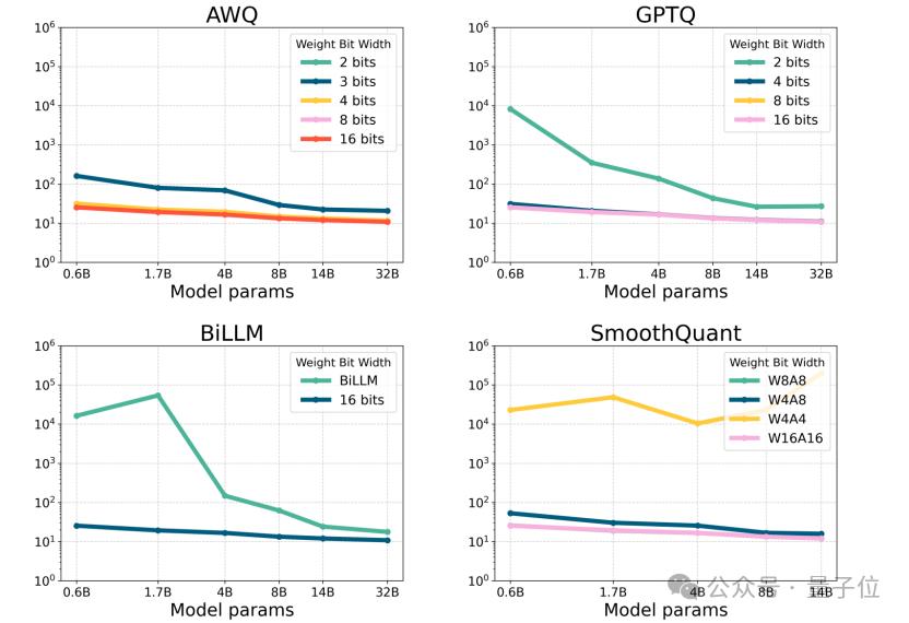 团队测试了5种经典PTQ方法,包括Round-To-Nearest (RTN)、GPTQ、AWQ、SmoothQuant和BiLLM,覆盖从1比特到8比特的位宽。