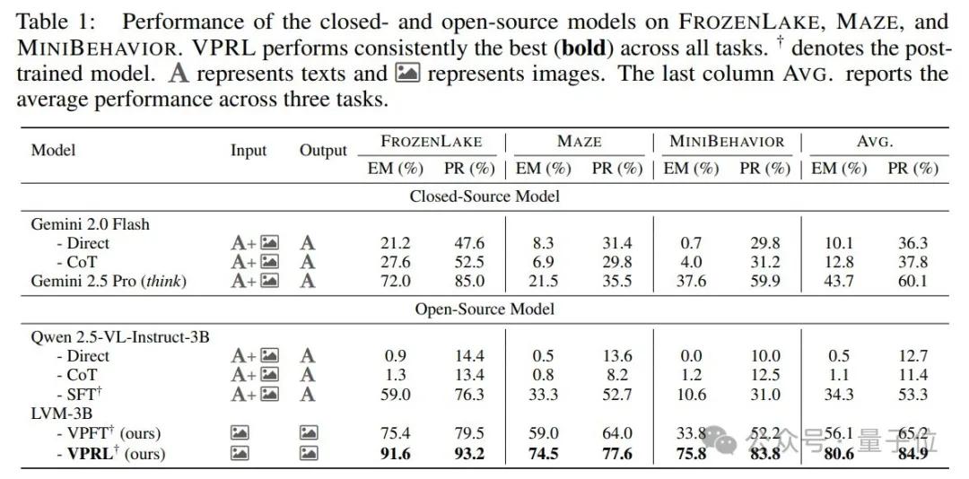 视觉规划(VPFT和VPRL)在所有任务上都取得了最高分,如表所示,VPRL在三个任务中平均EM高达80.6%,远超文本基线(如Gemini 2.5 Pro平均EM为43.7%)。