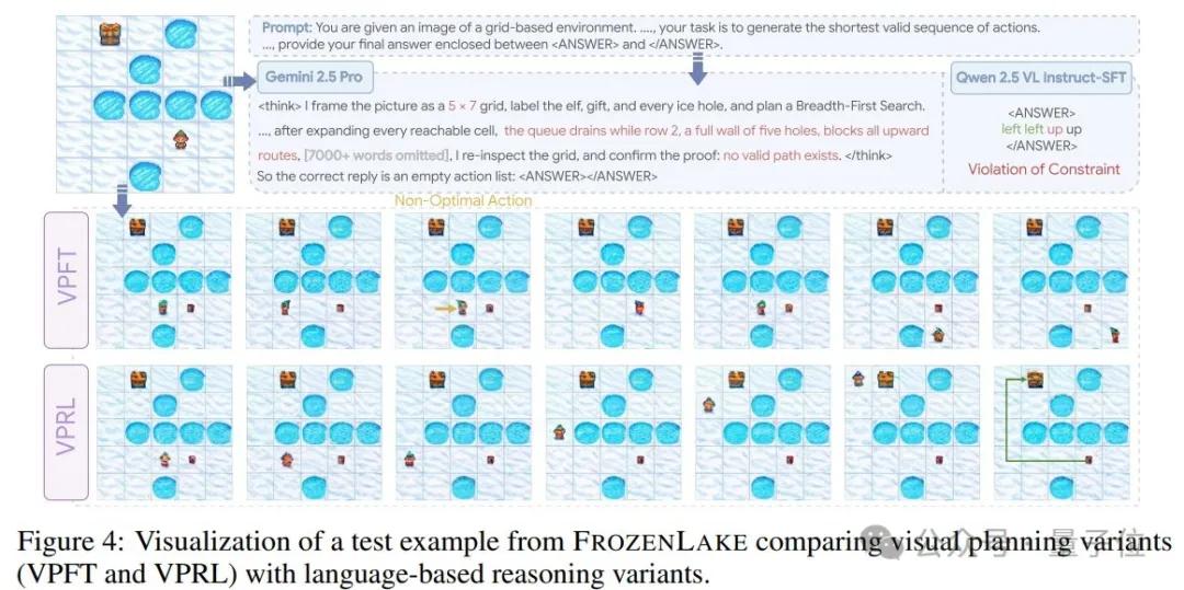 除了VPRL,研究团队还选用了几种系统变体作为基线,分别是基于微调的视觉规划 (VPFT)和文本中的监督微调 (SFT),以比较基于语言和基于视觉的规划,同时评估强化学习的作用。