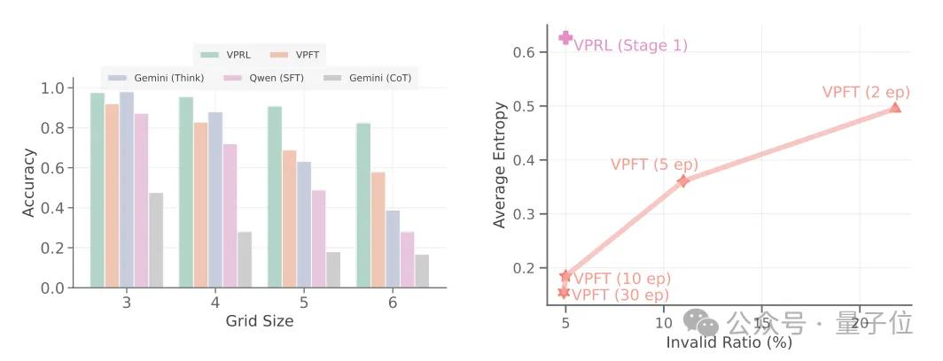 与此同时在鲁棒性上,随着网格尺寸增大(如FrozenLake从3×3到6×6),VPRL性能下降平缓(EM从97.6%降至82.4%),而Gemini 2.5 Pro从98.0%骤降至38.8%,充分体现了VPRL更强的稳定性。