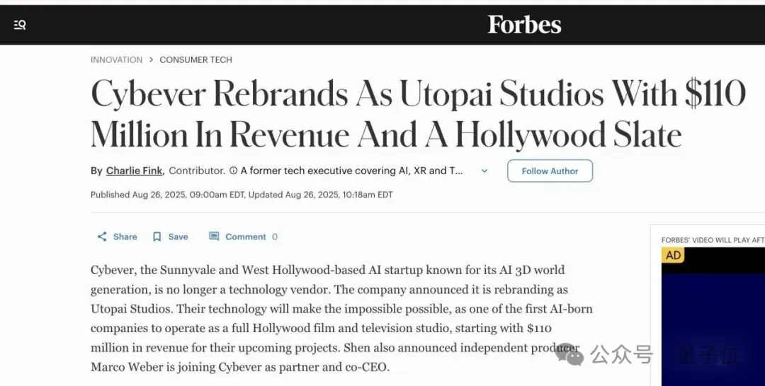 殊不知早在今年4月底,Utopai的故事就被搬上了著名杂志《福布斯》。而刚《福布斯》在今年8月又独家报道了他们的故事,并称其道:“Utopai的故事,标志着AI公司在媒体领域定位的转变。他们并不打算向工作室系统出售模型或API,而认为真正的价值在创造和拥有知识产权。这种模式,与皮克斯曾经将其图形工具转变为叙事引擎的做法如出一辙。”