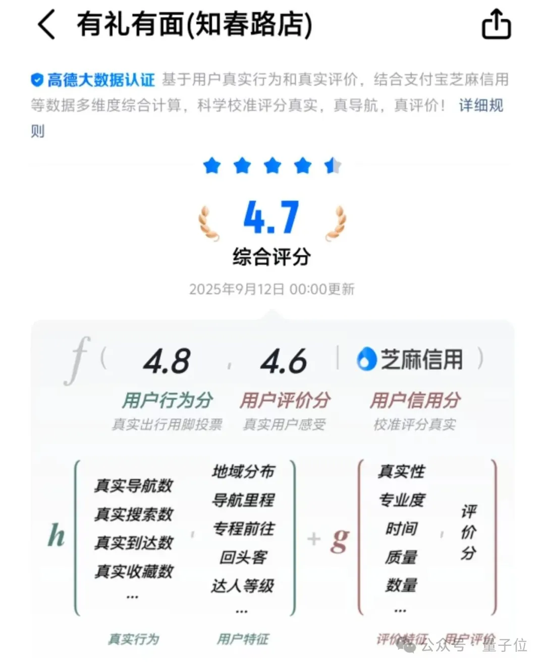 以前面提到的门店为例,它在「高德扫街榜」的综合评分是4.7分。这个评分的构成很复杂,背后是一个复合函数,含有多个变量,还有芝麻信用校准。