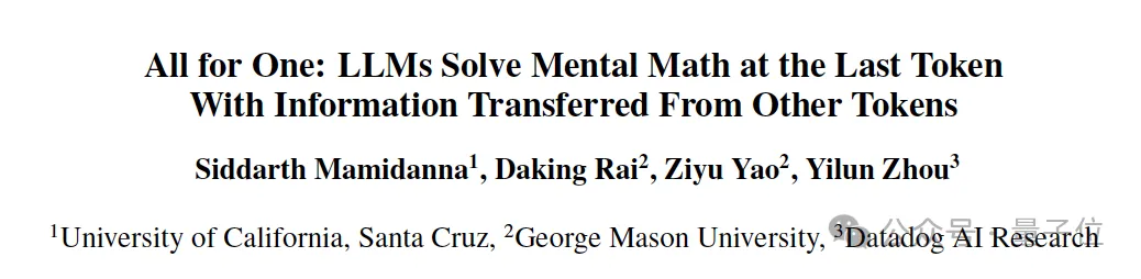 最近,来自加州大学圣克鲁兹分校、乔治·梅森大学和Datadog的研究人员发现:在心算任务中,几乎所有实际的数学计算都集中在序列的最后一个token上完成,而不是分散在所有token中。
