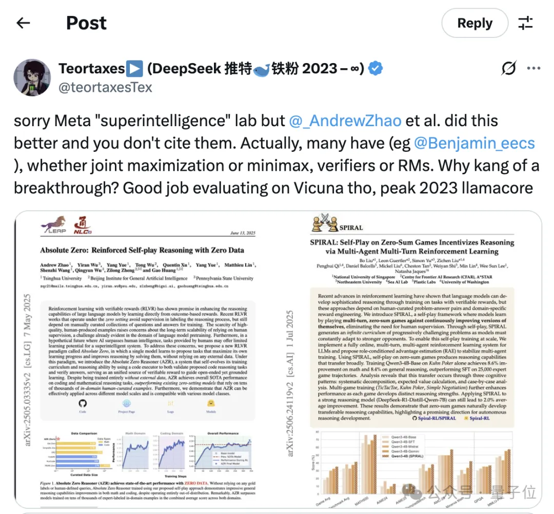 抱歉了,Meta“超级智能”实验室,但 @_AndrewZhao 等人的工作做得更好,而你们却没有引用。其实很多人都做过类似研究(比如 @Benjamin_eecs),无论是联合最大化还是极小极大,不管是验证器还是奖励模型。为什么要把这说成是突破呢?你们在Vicuna上的评测确实做得不错,简直是2023年LLaMA社区的典型操作。