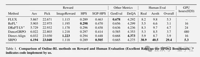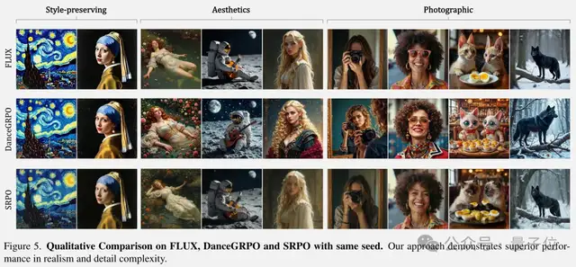 值得一提的是,DanceGRPO虽然也能提升美学质量,但经常引入不良伪影,如过度的光泽感和明显的边缘高光。相比之下,SRPO生成的图像在保持高美学质量的同时,纹理细节更加自然真实。