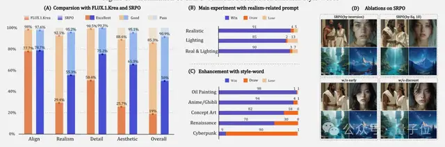 结果显示,在真实感维度上,原始FLUX模型的优秀率仅为8.2%,而经过SRPO训练后飙升至38.9%。在美学质量上,优秀率从9.8%提升到40.5%,总体偏好度更是达到了29.4%的优秀率。