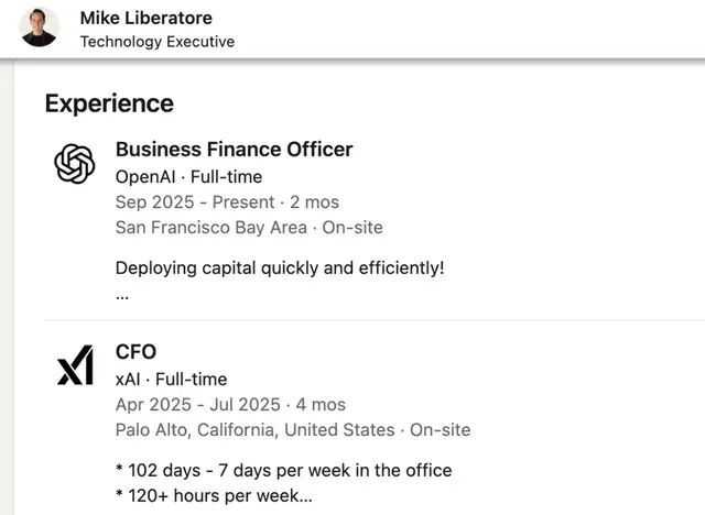 奥特曼正在扩充他的顾问团队,9月份刚挖来了马斯克xAI前CFO Mike Liberatore担任业务财务官,或许还有更多的大交易还在路上。